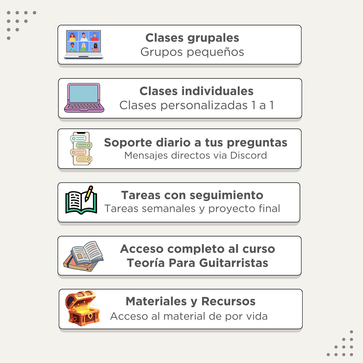 El curso Teoría Para Guitarristas es un curso pregrabado, asincrónico y 100% autodidacta. Teoría con Propósito es un programa intensivo que si bien se basa en un temario similar, es un programa sincrónico y altamente personalizado. El programa consiste de clases grupales, sesiones individuales, seguimiento de tareas y apoyo directo, para asegurar el aprendizaje en 12 semanas.🎸 Y si ya soy alumno/a del curso Teoría Para Guitarristas?