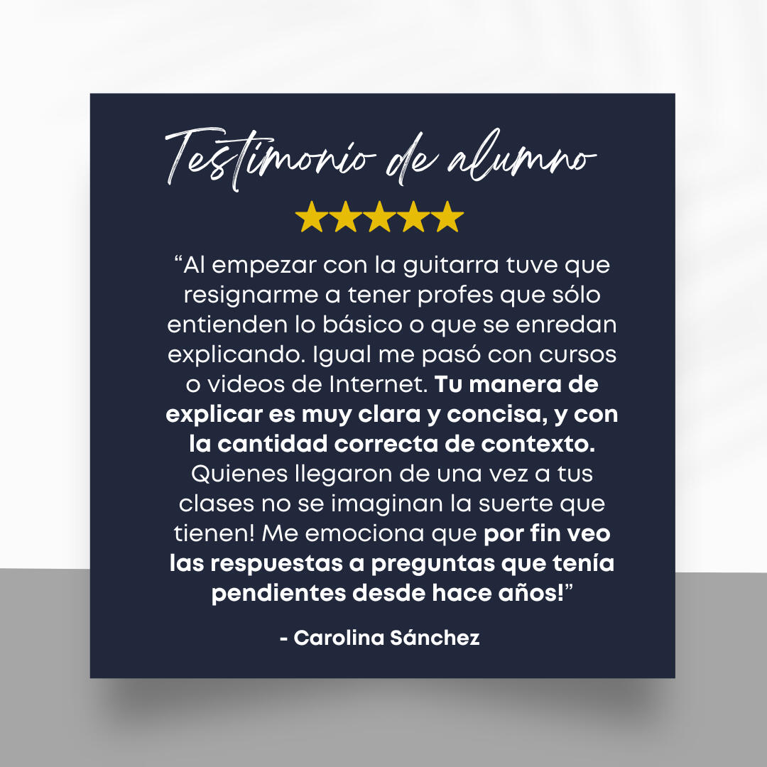 Si ya sabes lo básico de teoría entonces las primeras semanas del curso servirán como repaso, y aprenderás como aplicar todos estos conceptos directamente a la guitarra.🎸 Qué pasa si me inscribo al programa y no estoy satisfecho/a?